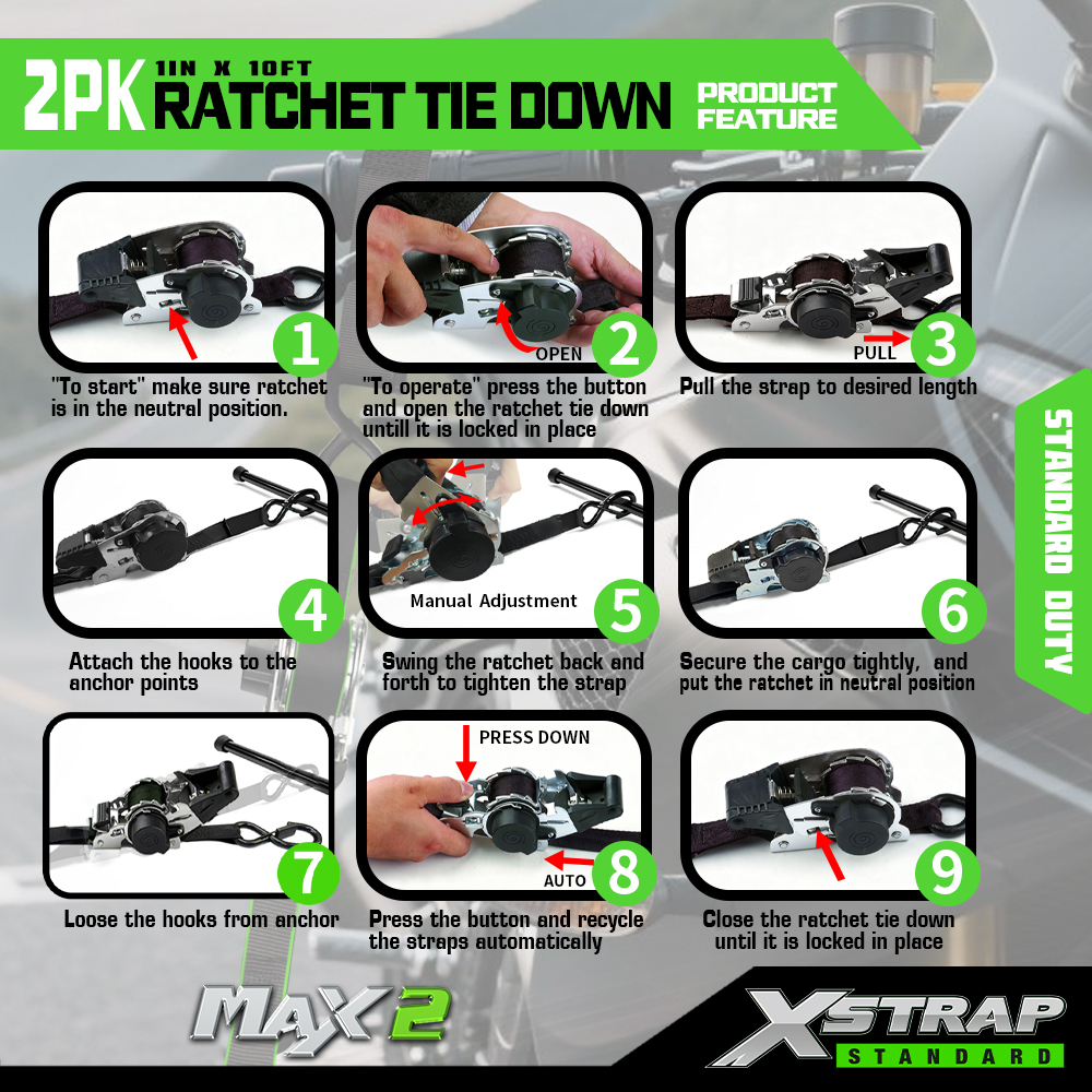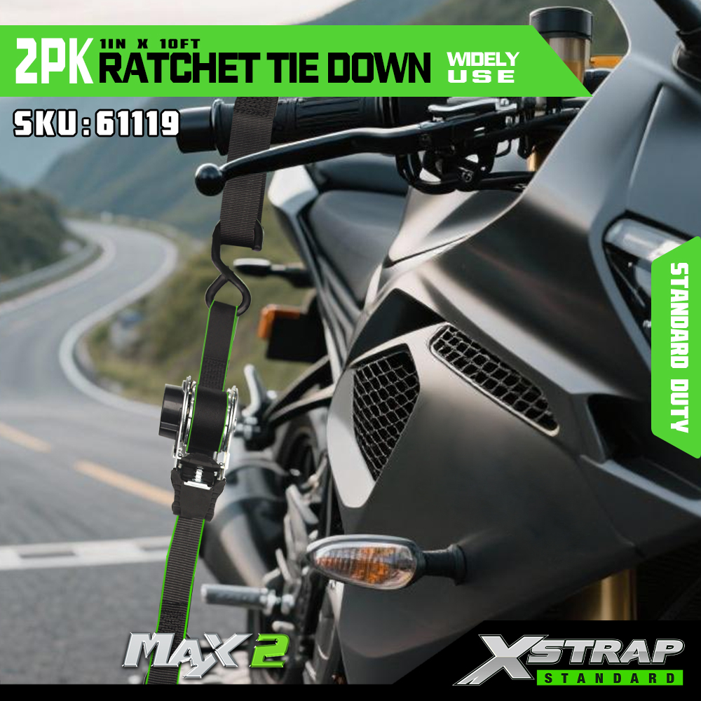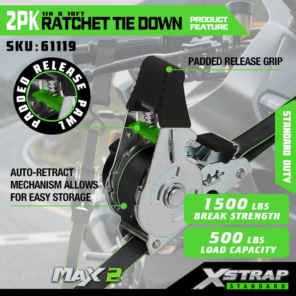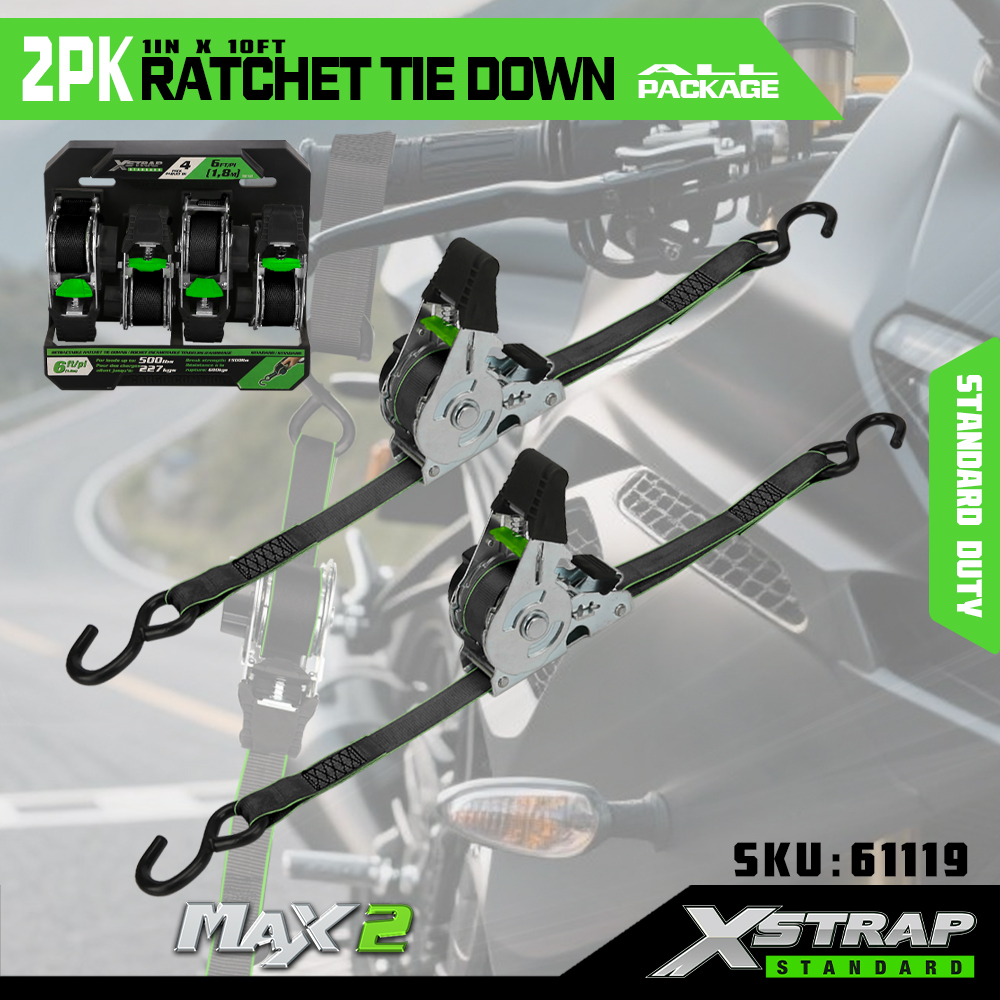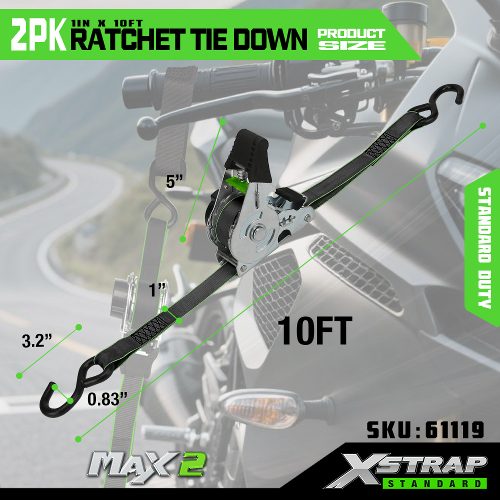 Xstrap 2 Pak Ratchet Tie Down, 1" x 10" Polyester Tie Down Strap Pull Ratchet Strap, 500 lbs Kapacitet Cargo Surring Sikringsstropper med S kroge til pickup, SUV, Car Top Racks motorcykel, let fiskebåd, jetski, snescooter.