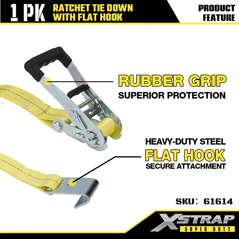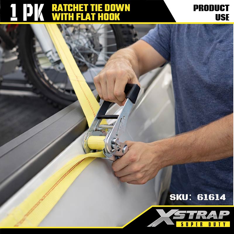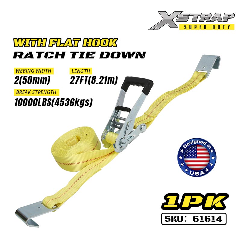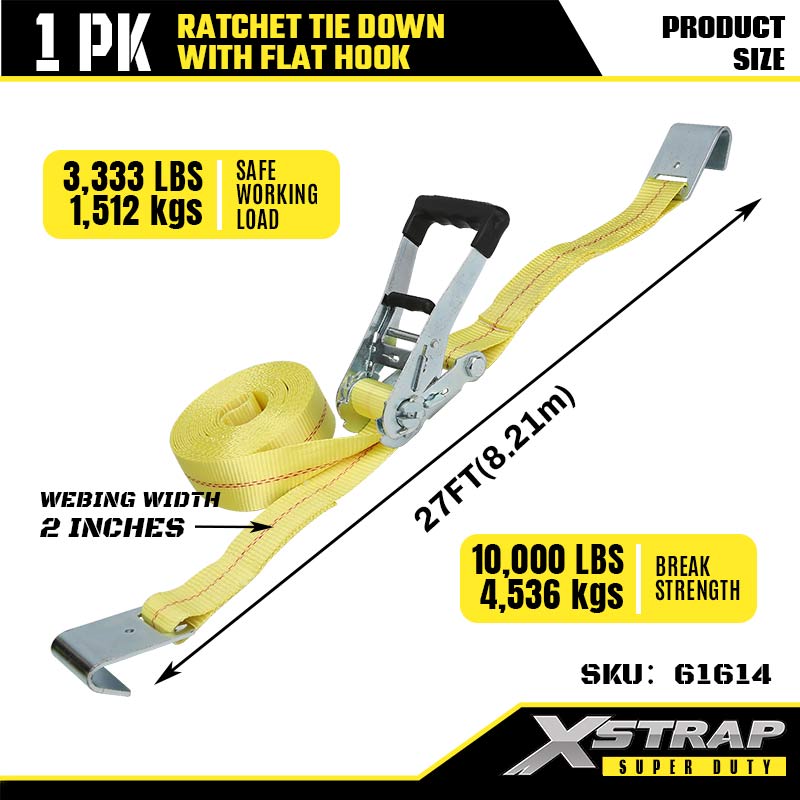 Xstrap Ratcet Tie Down med flade kroge, 2" x 27' Polyester Tie Down Strap Ratchet Strap, 3333lbs Kapacitet Cargo Surring Sikringsstropper med flade kroge til Heavy Duty Trailer, Flad Bed Trailer Skibåd, Lille Bil, Tungt Udstyr.